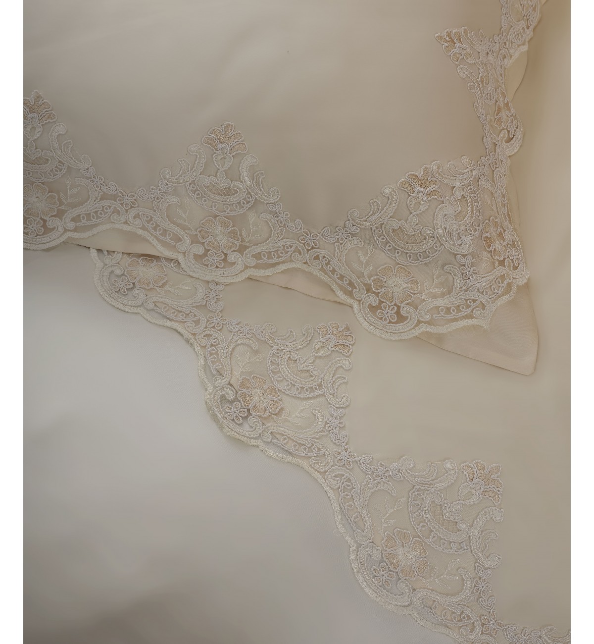 - Tessuto raso/cotone 100% e pizzo rebrodé rifinito a mano